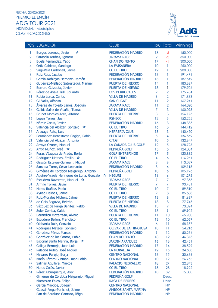 El pasado domingo tuvo lugar la tercera prueba puntuable del ADG 2021 en El Encín, campo muy conocido por todos ya que es un clásico del Tour. Como viene siendo habitual en este ADG, la lluvia parecía que iba a ser protagonista, pero no apareció hasta el final de la jornada, afectando a 3 partidos que tuvieron que dejar de jugar al escuchar la sirena que avisaba de tormenta eléctrica para volver media hora después. Bravo por esos jugadores pues un domingo a esas horas y en frío uno está pensando más en llegar a casa que en recuperar el swing.