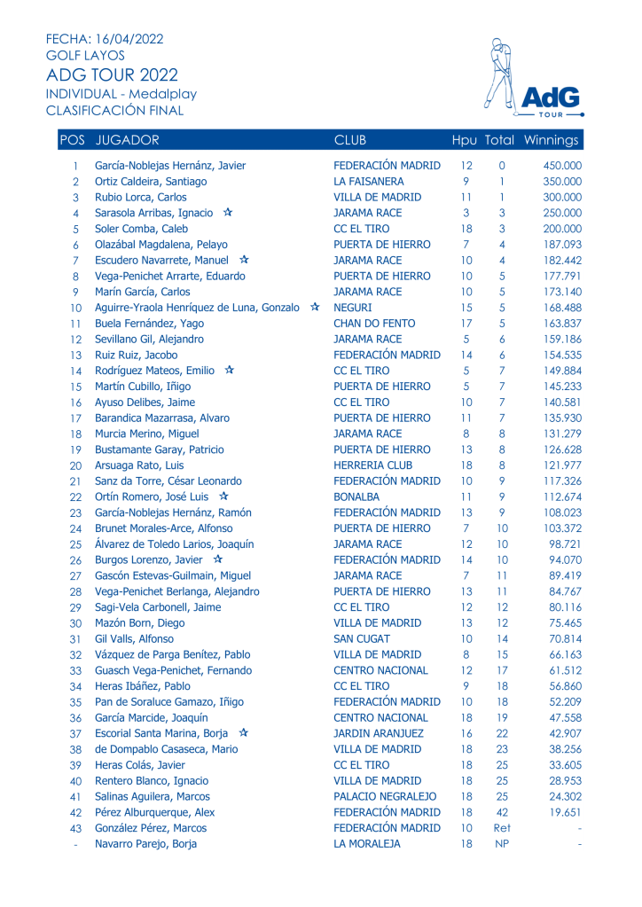 Este domingo se dio el pistoletazo de salida al ADG Tour 2022. 43 jugadores llegaron a Layos dispuestos a sacar su mejor golf en un campo que si ya de por sí es difícil, cuando sopla el viento como lo hizo ayer afila sus garras y al menor descuido te lanza un croché que te deja noqueado unos cuantos hoyos.