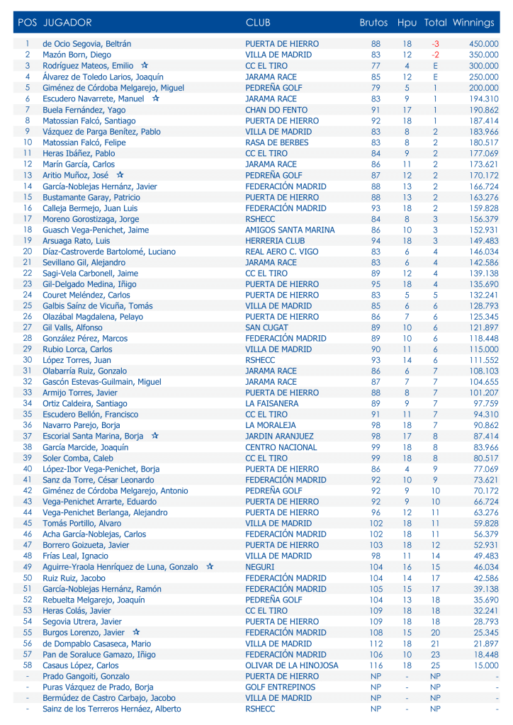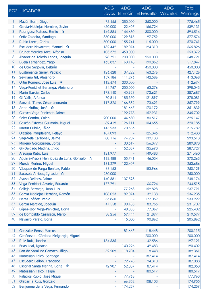 Viendo el vendaval que estaba cayendo sorprendía ver tantos jugadores en negativo durante el primer tercio del torneo. Casi como en cualquier otro ADG. Asomaban varios jugadores que este año están mostrando las patitas con frecuencia: Aritio, Buela, Gil, Alvarez de Toledo… Cumplido el segundo tercio Aritio se destacó, al igual que hizo en El Encín, llegando al amen corner con un -6 en su casillero. Al poco bajó a -4, empatando con Beltrán de Ocio pero aún al frente de un grupo que aguantaba en negativo entre los que estaban Felipe Matossian, Jaime Guasch y Emilio Rodríguez. Pero el medal, el maldito medal, ese que nos tritura el cerebro, acudió de nuevo a la llamada y dejó la pelea reducida a 2 jugadores (se estará guardando Aritio para rematar en La Gran Final?), Beltrán de Ocio y un sorprendente Diego Mazón que no se había dejado ver hasta entonces pero que fue escalando posiciones poco a poco. Ellos 2 fueron los únicos que acabaron por debajo del par, siendo Beltrán el ganador del torneo con -3. Enhorabuena! Repite puesto que ya ganó el año pasado! Segundo Diego Mazón con -2 y en el tercer puesto acabó un grandísimo Emilio Rodríguez, que hizo la friolera de 14 pares seguidos para acabar al par. Muy grandes los 3.