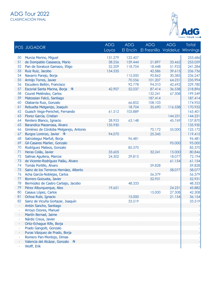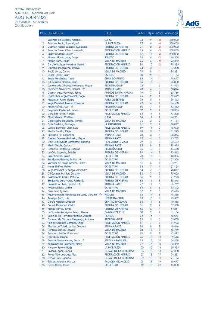 Pero en los últimos 6 hoyos emergió la figura de Antonio Valencia, quien terminó su vuelta con 3 birdies y 3 pares para un total de -8, dejando que el resto se peleasen por el segundo puesto, que se lo llevó Sepe con -4, y por el tercero, para Guillermo Guzman con -3. Enhorabuena a todos pero especialmente a Antonio, quien hace nada estaba recuperándose de una grave lesión y al que sólo le valía la victoria para poder jugar La Gran Final por no haber podido jugar 2 de los 3 torneos anteriores. Bravo!