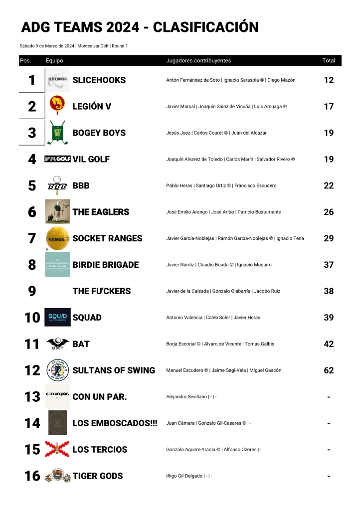 En el primero Tornedo del ADG Teams resultaron ganadores los SliceHooks, haciendo valer no sólo la victoria de Antón sino el buen hacer de sus otros dos miembros, Ignacio Sarasola y Diego Mazón. Vaya tres jugones hay en este equipo! En segundo lugar Legión V y terceros Bogey Boys