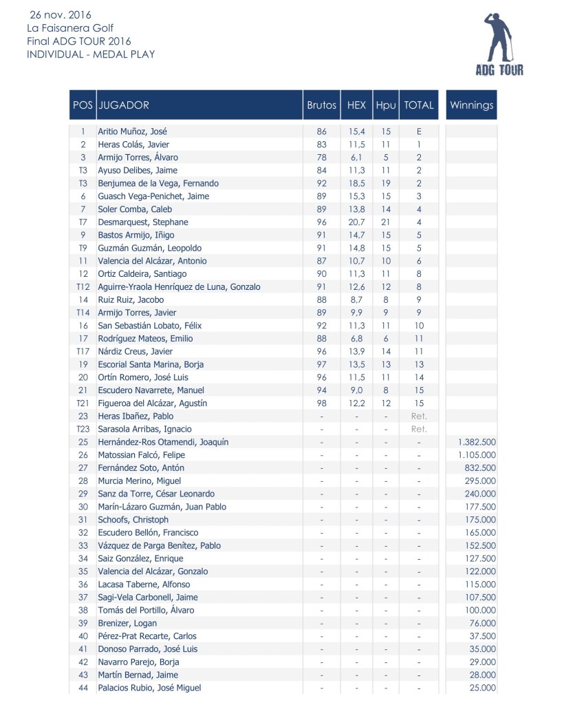 Según las bases se jugaría un playoff a tres hoyos. En caso de seguir el empate se seguirían los hoyos en orden jugando a muerte súbita. Un doble bogey para los dos en el primer hoyo, evidenciaba el estado de nervios de ambos jugadores. Bogey para peras en el segundo frente a un par de Josito, le hicieron salir al último hoyo con un golpe de ventaja. Buena salida ambos en el tercero, pero un segundo golpe de peritas antológico dejó su bola a dos metros de bandera en un putt cuesta arriba. Josito se quedó algo corto de green y un mal approach dejó su bola de tres golpes a unos 8 metros de bandera. Tiró un putt con decisión pero se pasó metro y medio la bandera, dejándose un putt cuesta abajo para bogey… La tensión se podía cortar un cuchillo. Putt de birdie para peras para ganar. Silencio sepulcral. Encara la bola y roza hoyo. Par. Putt cuesta debajo de metro y medio para Josito para empatar. Dentro. Espectacular. Salimos al cuarto hoyo. Par tres con punto para Josito. Salen los dos cortos y a la izquierda. El primero en aprochar es Josito que una vez más con nervios de acero la deja en green a 3 metros del agujero. Turno para Peras. Sabe que si quiere tener opciones tiene que ser muy certero en ese approach para meter presión… Se pasa tres metros y falla el putt de vuelta. Josito sabe que dos putts y el viaje es suyo. Hace un primer putt razonable dejando la bola a dos palmos, y después de pensárselo muy mucho emboca el putt de la victoria. Enhorabuena Don José Aritio ganador del ADG´16. Enhorabuena también a Peras dando una vez más una lección de tesón y temple!!