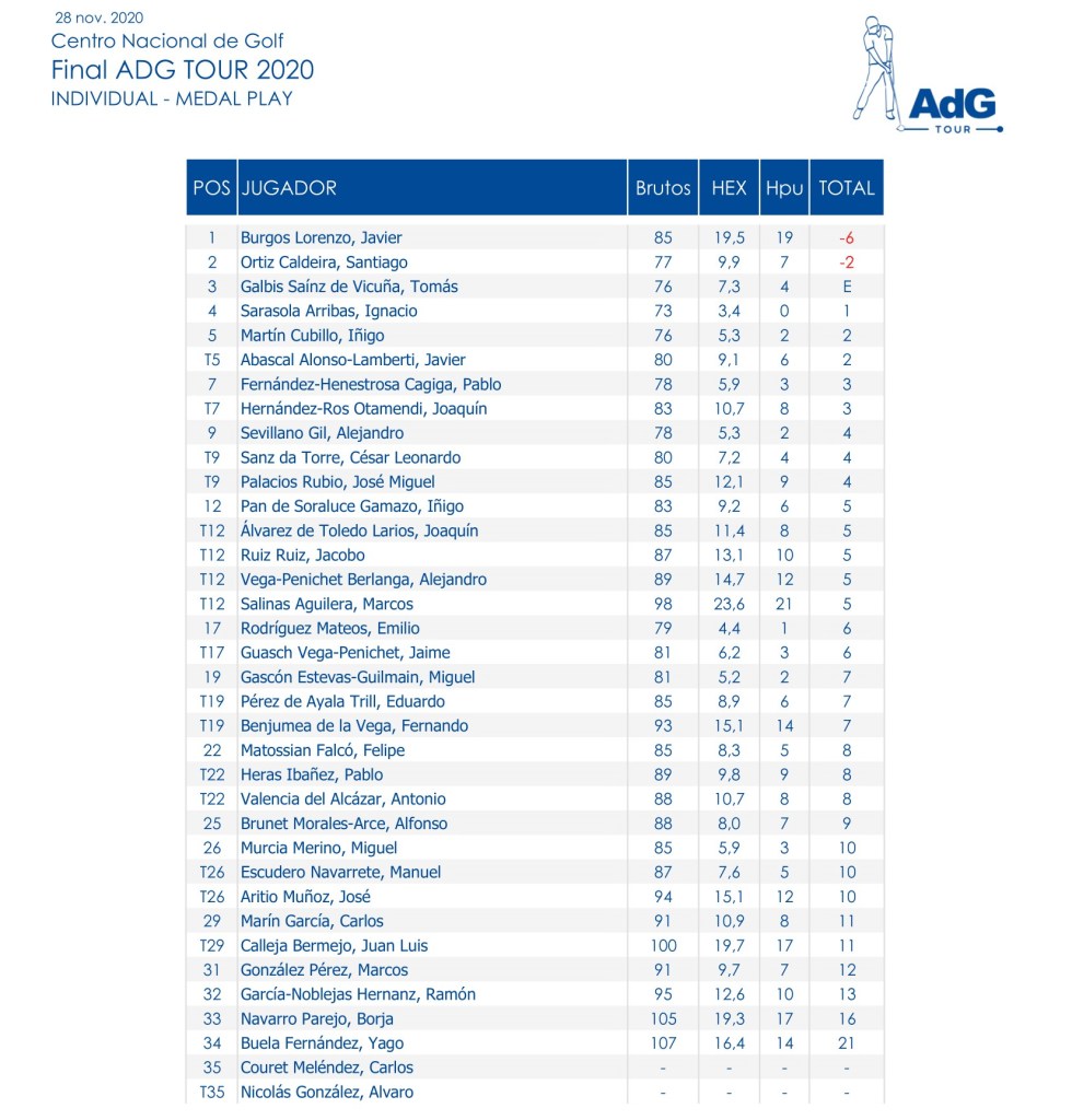 En los primeros compases aparecían por arriba Jaime Guasch, Felipe Matossian, Alejandro Sevillano, Tomás Galbis, Cobo, Fernando Benjumea y Javier Burgos. Todos ellos en números rojos incluso comenzando la segunda vuelta. Tomás Galbis no quería dar su brazo a torcer y en el hoyo 11 lideraba la prueba con un impresionante -3, empatado con un incombustible Javi Burgos y un golpe por delante de Fernando Benjumea, éstos saliendo aún del 10. Un doble bogey tanto de Tomás como de Fer, unidos a un impresionante birdie de Javi en el 11 empezaban a decantar la final. Por detrás asomaba Yago Ortiz que venía con un +1 pero como una moto. En casa club el mejor resultado era un +2 de Javier Abascal, a quien le duró poco la alegría pues Yago confirmó la buena racha y marcó un -2 después de un fabuloso birdie desde fuera en el 18. Mientras tanto, saliendo del 16 estaban Javi Burgos (-6) y Fer Benjumea (-3). Par 5 con agua donde pueden pasar muchísimas cosas. Tantas que Javi cometió el único error del día y salió de ahí con un triple bogey… pero peor le fue al bueno de Fer, quien vio de frente al monstruo del medal y con un devastador 15 se despidió de toda opción de entrar en premios. Javi aún debía trabajárselo pues el -2 de Yago era muy competitivo. Y vamos si lo hizo ya que acabó con -6 la ronda, haciéndose con la final del ADG Tour 2020 y uniendo su nombre al de los otros 8 ilustres ganadores anteriores. Yago terminó segundo y finalmente Tomás fue quien se llevó la tercera plaza cumpliendo su handicap. Enhorabuena a los tres y especialmente a Javi! Gran ronda para ganar!