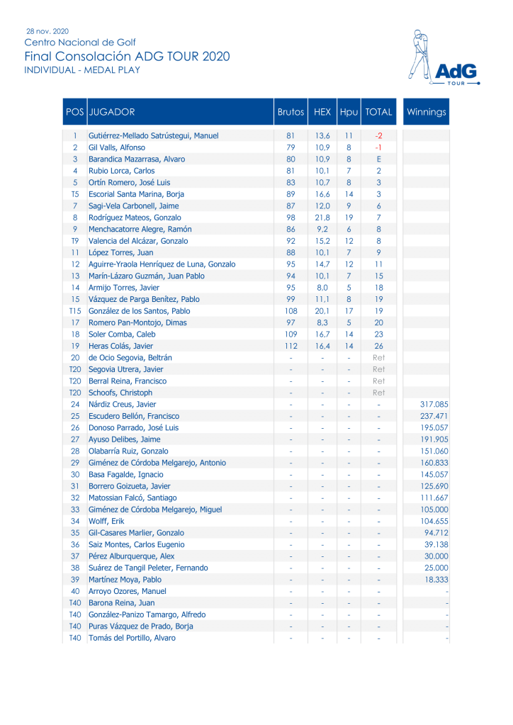 Paralelamente se jugó la ya establecida final de consolación. También sólo 2 jugadores acabaron por debajo del par, siendo Manuel Gutiérrez-Mellado con -5 quien se llevó el gato al agua, seguido de Alfonso Gil con -1 y Alvaro Barandica al par. Enhorabuena a los tres!